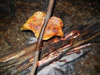 Jako, że było już dość późno, a wiatr ciągle zmieniał kierunek, rozpaliliśmy ognisko i resztę dnia spędziliśmy się upajając ciepłem od niego bijącym i zapychając nasze żołądki. Kubush wrzucił na kija kuraka, którego wcześniej przetrzymał w zalewie, także po kilku godzinach leniwego opiekania ucieszył nim nasze podniebienia.