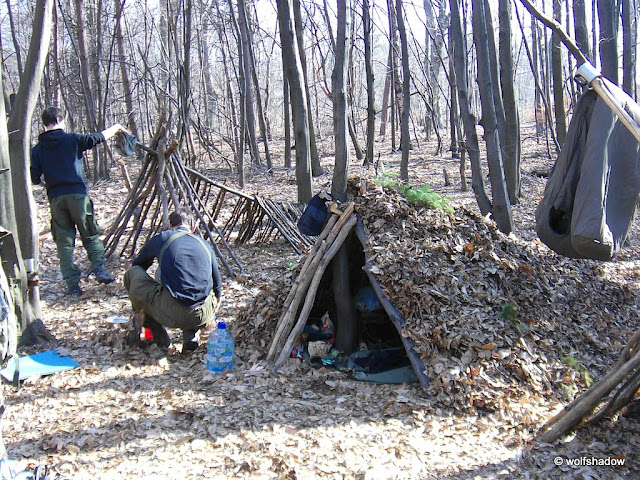Kalenicę, o ile można to tak w tym wypadku nazwać, zaparłem rozwidloną gałęzią o drzewo, a szkielet ułożyłem z leżących wszędzie na około suszek i gałęzi. Z bólem serca muszę przyznać, że bardzo użyteczny przy tej czynności okazał się Rzufowy Laplander. Kiedyś było trzeba. No dobra, mam to za sobą. Całość obrzuciłem niespecjalnie grubą warstwą ściółki, zbieraną po okolicy, żeby nie wydepilować całkowicie terenu na około szałasu.